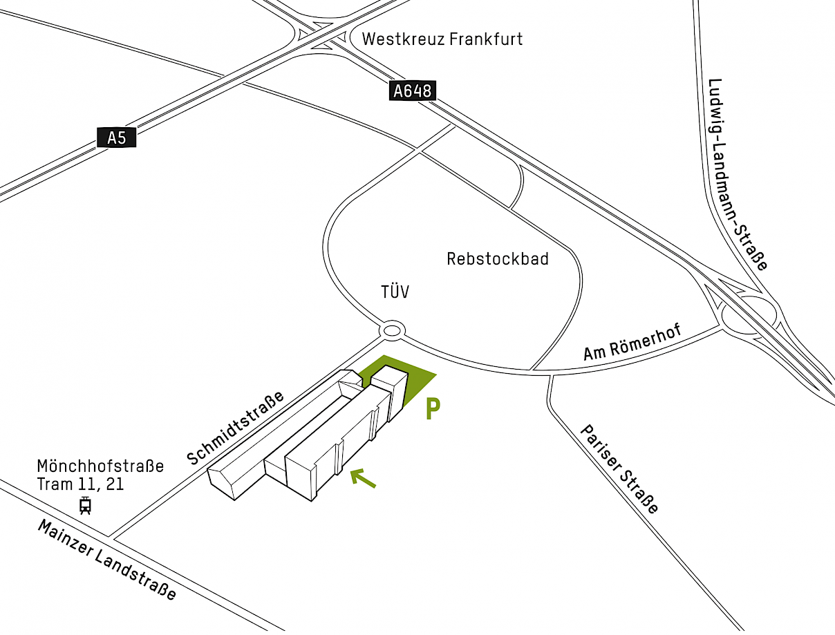 Von den S-Bahn-Stationen Hauptbahnhof oder Galluswarte erreichst du uns mit der Tram 11 oder 21 (Richtung Zuckschwerdtstraße bzw. Nied Kirche). Von der Haltestelle Mönchhofstraße sind es etwa 300 Meter Fußweg zu den Atelierräumen.
